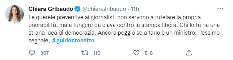 Guido Crosetto non ha perso tempo e con un cinguettio ha annunciato la prima azione legale.